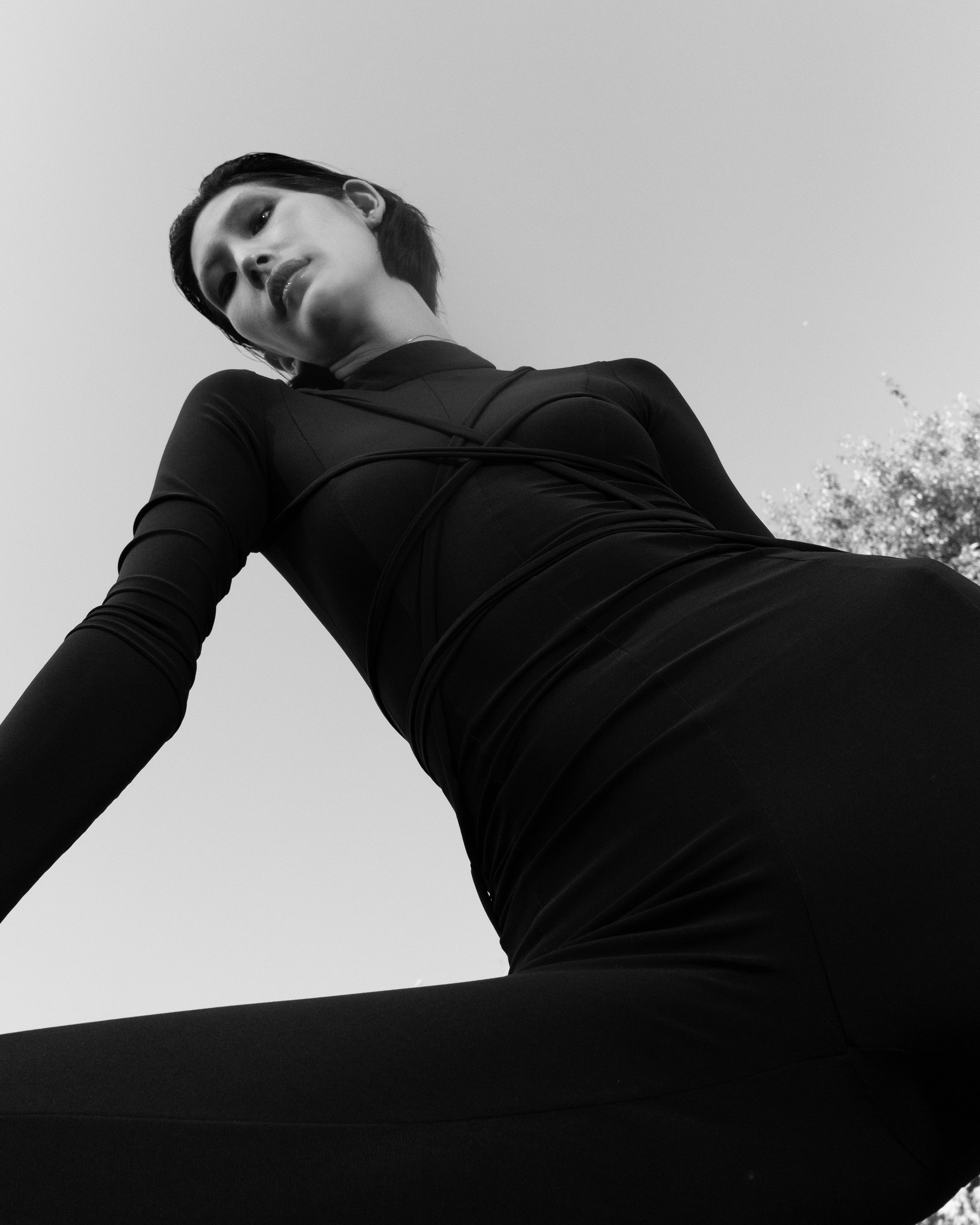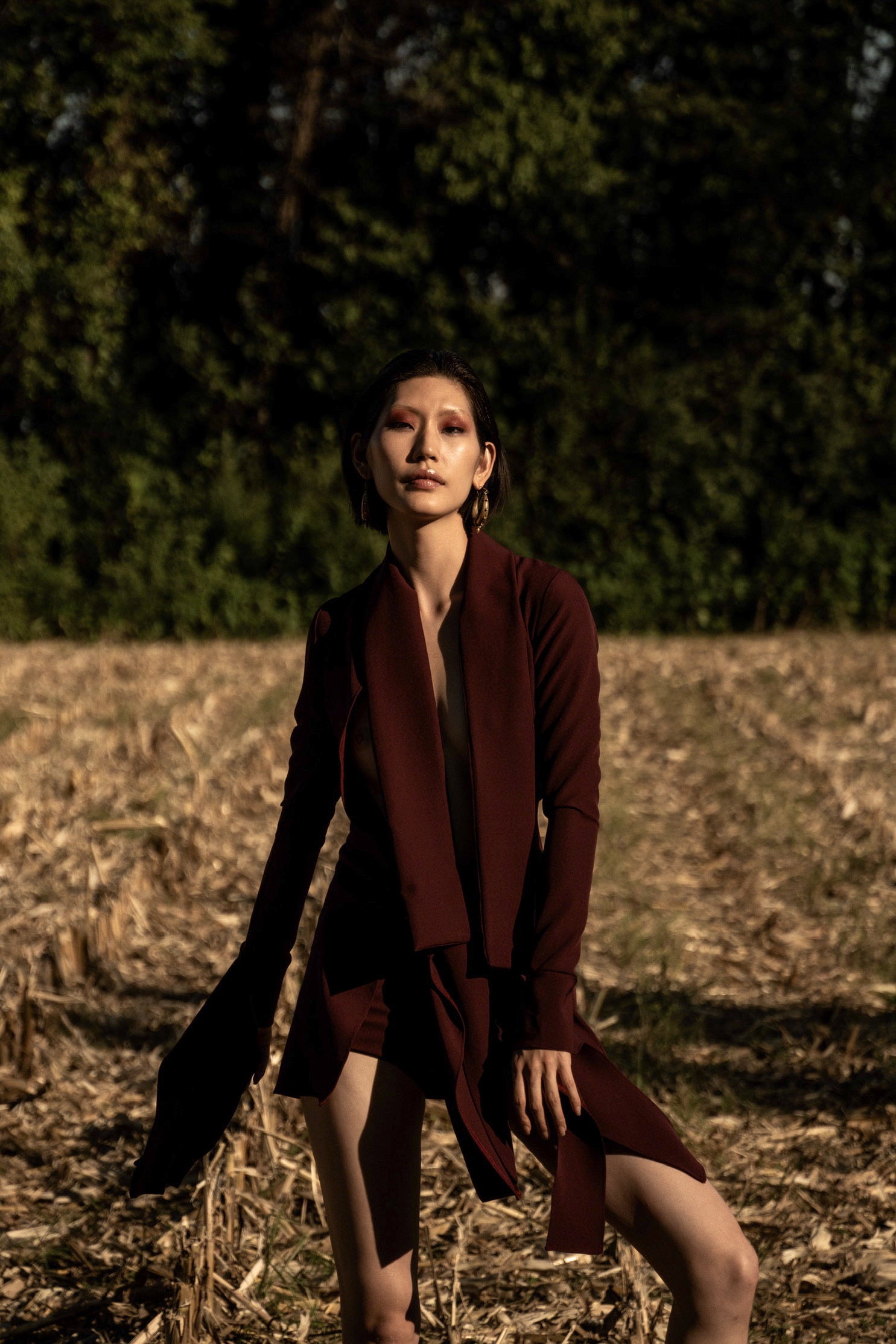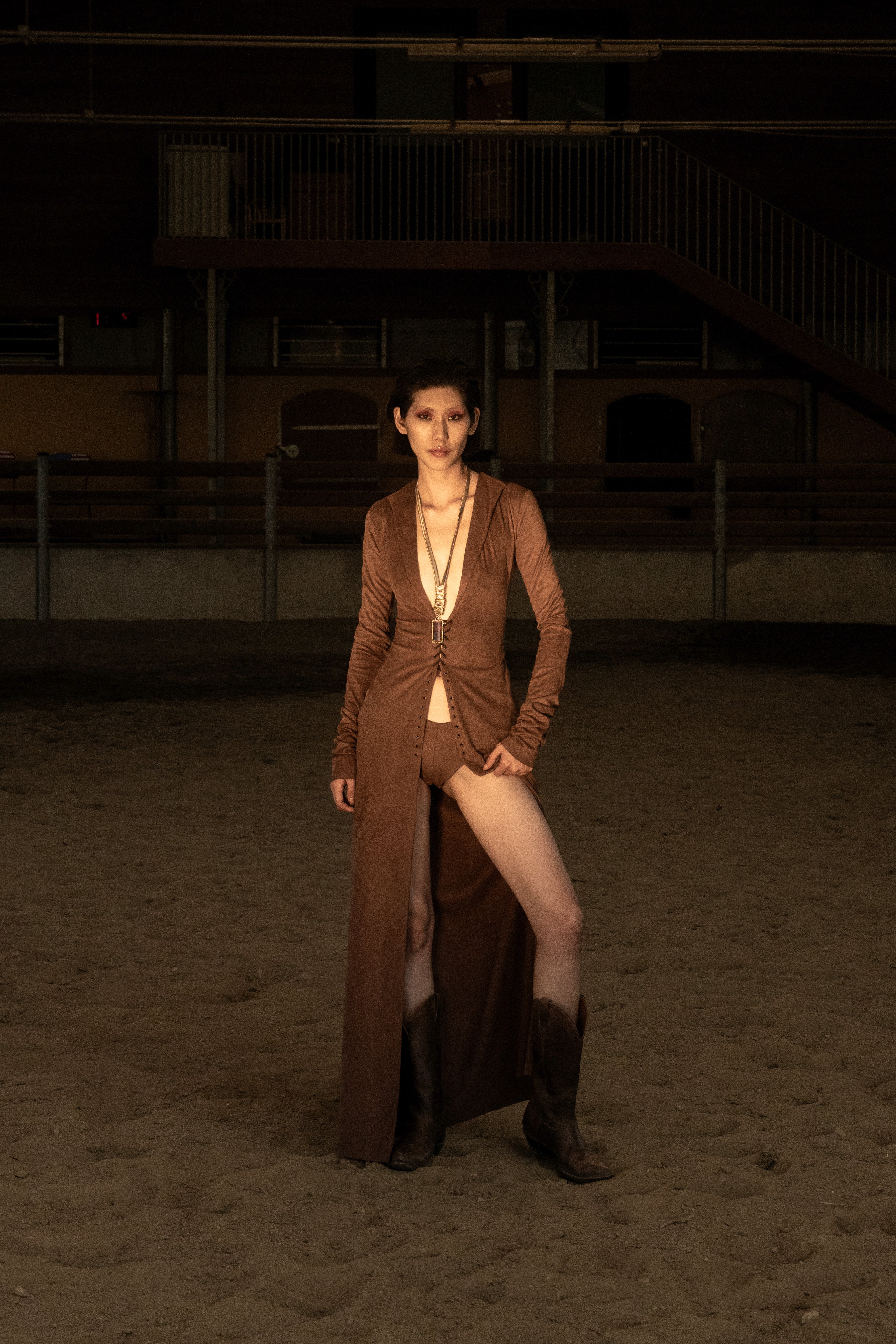 The collection embodies a wild yet refined elegance, with pieces that capture a perfect balance between inner strength and sensuality. Earth-inspired tones, like deep burgundy and green, reflect a bond with nature, while enveloping silhouettes and bold cuts emphasize feminine power. Every detail is crafted to highlight the wearer's assertive personality: flowing dresses with plunging necklines alternate with sculpted designs, embodying the duality of a woman who is both graceful and resolute. Form-fitting leather tops express boldness and confidence, adding a rebellious edge. "